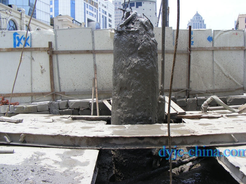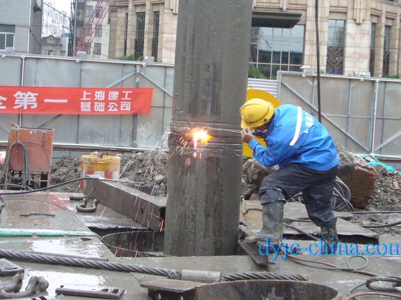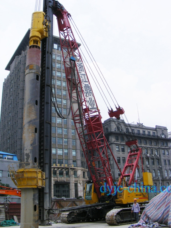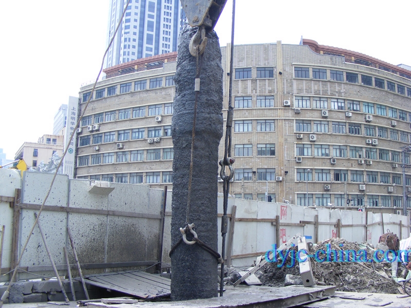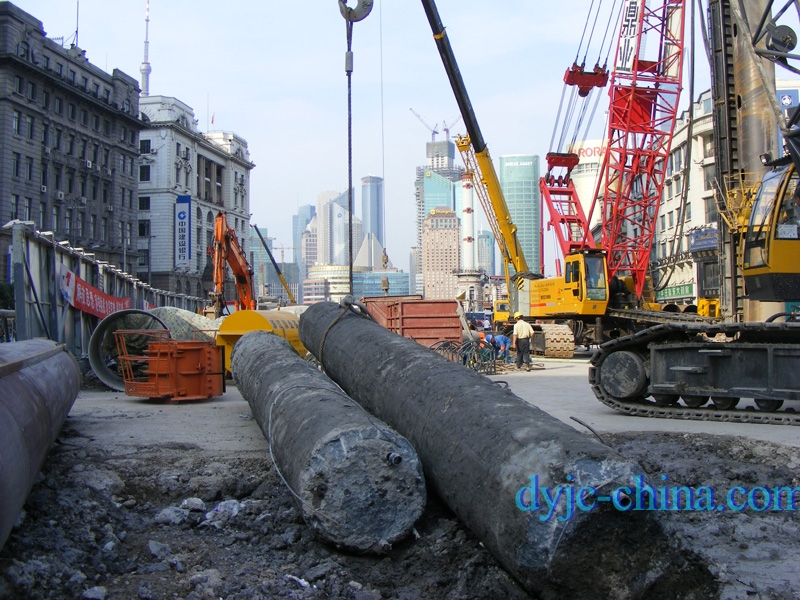 由于上海市外灘通道改建工程施工的要求,需將著有“亞洲第一灣”美稱的延安東路到外灘區(qū)間的高架拆除,由于在繁華的上海外灘開發(fā)地下通道和發(fā)展地下空間的需要必須將該段部分地下樁基拔出和清除。由于樁基深度均為55~60m,并且地下管線密布、周邊保護(hù)性標(biāo)志建筑物較多、緊臨延安東路隧道,因此本工程的施工存在高難度。我公司采用專利設(shè)備藝技術(shù)FCEC內(nèi)外正逆雙回轉(zhuǎn)全套管機(jī)(專利號:200710130067.7)采用配置雙重鋼套管進(jìn)行拔樁清障施工。該設(shè)備工藝采用鋼套管快速旋轉(zhuǎn)切割沉入的工藝,將鋼套管旋轉(zhuǎn)切割沉入至62m左右,樁與土體之間快速切割后實(shí)行土體分離減摩,施工速度快,對周邊土體及建筑物擾動很小,實(shí)現(xiàn)將舊樁一次性徹底清除的目的,該拔樁工程中清除的舊樁為上海市目前拔除的最深的鉆孔灌注樁(樁徑Φ800mm、Φ1000mm,樁長53-55m)及PHC管樁(樁徑Φ600mm,樁長53-55m)。