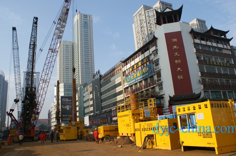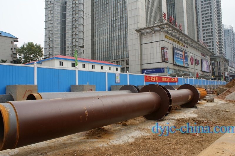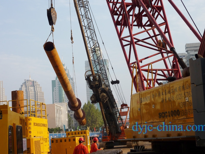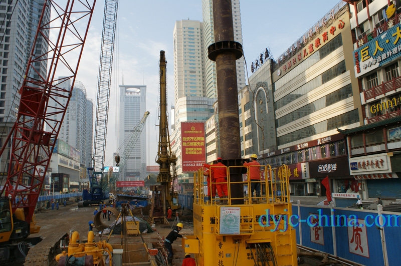中南路站是地鐵二號線與地鐵四號線的合設車站,總建筑面積30804.56m2?;娱_挖深度達17.9m,頂板覆土厚度約為2.5~3.0m。車站周邊建筑物群立,車流、人流眾多,屬繁華商業(yè)區(qū)之一,地下各類管網密布,為施工復雜地段。綜合考慮安全、質量,為減少對周邊道路交通及環(huán)境的影響,采用逆作法施工,逆作法施工永久性鋼管柱安裝采用HPE液壓垂直插入鋼管柱施工,永久性鋼管柱直徑Φ800mm,長度16.5m?;娱_挖深度深,地下兩層,為保證基坑底部樁中心尺寸的準確,永久性鋼管柱垂直度偏差≤L/500(L為鋼管柱的長度),且不大于25mm。