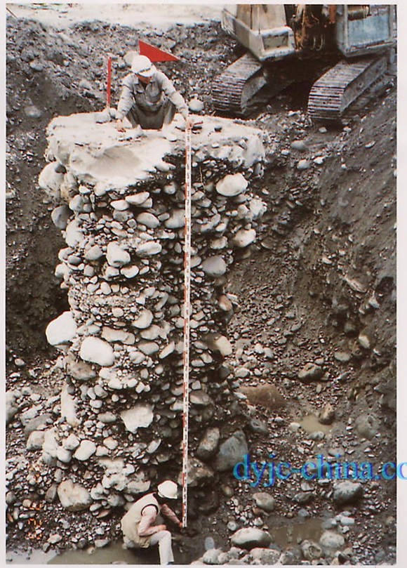 超級(jí)高壓噴射工法卵石層中高壓噴射成樁試挖。