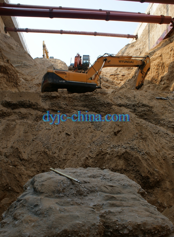 在北京地下35m砂卵石層高壓旋噴樁預(yù)定樁徑1.8m的樁徑最大達(dá)到2.0m以上,最小樁徑1.8m;單獨(dú)一個(gè)樁徑達(dá)到2.2m。咬合樁徑在1.8m以上,咬合處水泥土強(qiáng)度高