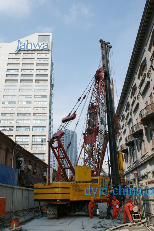上海外灘通道綜合改造的重點(diǎn)工程從吳淞路閘橋天潼路地下隧道穿越浦江飯店和上海大廈蘇州河橋底下至福州路,距離隧道邊線到浦江飯店最近僅 1.7m,距上海大廈最小凈距 3.7m,這兩幢建筑均具有百余年歷史,為上海市保護(hù)性建筑,該老房子的基礎(chǔ)和樁基情況又較差,大部分無樁基礎(chǔ),在隧道盾構(gòu)穿越所造成沉降的影響下,建筑物的結(jié)構(gòu)安全很難保證,可能出現(xiàn)地基沉降、墻體開裂、建筑物傾斜破壞等問題,安全風(fēng)險(xiǎn)非常大。因此必須進(jìn)行一定的加固措施,主要措施為在隧道與浦江飯店基礎(chǔ)的間隙內(nèi)采用鉆孔灌注樁進(jìn)行隔離,由于該工程不允許振動(dòng)和太大的擾動(dòng),因此普通鉆孔灌注樁根本不允許施工,所以采用擾動(dòng)最小的 FCEC工法來施工隔離樁,該工法采用正逆同步雙回轉(zhuǎn)全套管機(jī)械(專利號(hào):200720155651.3),內(nèi)外同步正逆鉆至底標(biāo)高,外鋼套管逆向旋轉(zhuǎn)、內(nèi)螺旋正向旋轉(zhuǎn)取出鋼管內(nèi)的土,外鋼套管護(hù)壁。而由于施工作業(yè)面狹小、地下管線錯(cuò)綜復(fù)雜,并且要求成樁垂直精度高(1/400)、不得造成周邊建筑物沉降過大,施工難度相當(dāng)大。