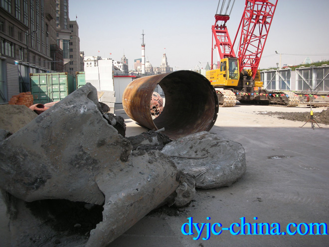 外灘通道是上海市“三縱三橫”交通主干網絡中三縱東線的組成部分,建造外灘地下通道的目的是緩解外灘地區(qū)的交通擁堵,分流三縱東線外灘的過境交通,改善外灘環(huán)境,提升城市功能,并服務上海世博會交通。因外灘通道改建工程圍護結構施工,多處區(qū)域內地下鋼筋混凝土結構、塊石、舊樁等障礙物需要清除。清障施工必須克服地下管線錯綜復雜、周邊建筑物較多(大多數是上海市保護性建筑)而且緊靠構筑物、施工場地狹小,且障礙物分布區(qū)域不詳。我公司采用360度全回轉套管鉆機、專利設備FCEC正逆雙向同步全回轉清障機(專利號:200720155651.3)進行施工,對地下土體擾動小、清障徹底,保證了上海外灘通道改建整體工程的順利施工