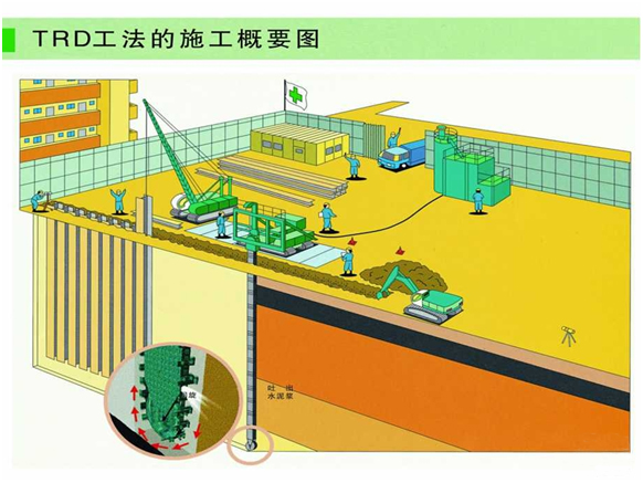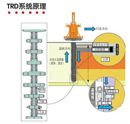 TRD工法(Trench cutting Re-mixing Deep wall method)渠式切割深層攪拌地下水泥土連續(xù)墻工法,一種在地面上垂直插入鏈鋸型刀端口連接刀鏈鋸,鏈鋸刀鉆(鏈式切削器)上下運動主機沿造墻方向水平移動,切剖出溝渠并注入固化液(水泥)使之和原位置的土混合,能在各類土層和砂礫石層中構(gòu)筑一道等厚的地下連續(xù)墻的一種施工方法。其主要特點是成墻連續(xù)、表面平整、厚度一致、墻體均勻性好。主要應(yīng)用在各類建筑工程、地下工程、護岸工程、大壩、堤防的基礎(chǔ)加固、防滲處理等方面。