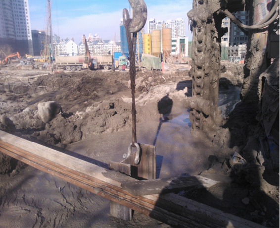 TRD深層攪拌墻為基坑止水帷幕,寬度800mm,深度為47.80m,共計(jì)約100延長(zhǎng)米;其中TRD深層攪拌墻需從基坑內(nèi)向外穿過(guò)已完成支護(hù)樁(間距1000mm,中間插入型鋼代替支護(hù)樁),從而包圍塔樓形成塔樓部分局部加深基坑的止水帷幕,施工精度要求較高。