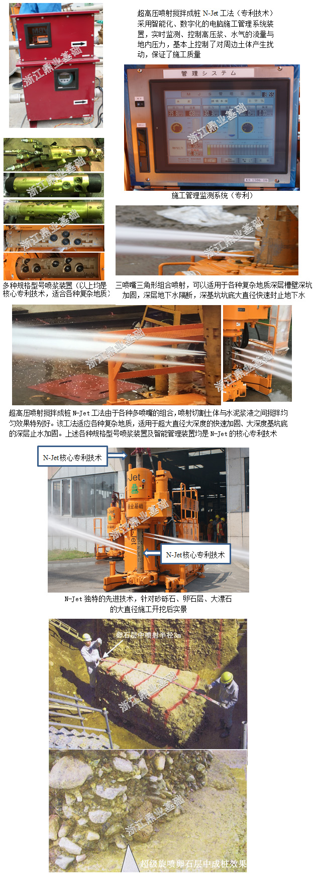 超高壓噴射注漿N-Jet工法(以下簡稱N-Jet工法)采用具有前端噴射注漿裝置的專用設(shè)備,通過多個可變角度的噴嘴噴射出包裹著主動空氣的超高壓漿液切削土體,并與土體均勻拌合形成加固體,可形成圓形、扇形、十字形等形狀。同時配有數(shù)字化施工管理系統(tǒng),對漿、氣流量及施工時的地內(nèi)壓力實時監(jiān)控,對周邊擾動小。地內(nèi)壓力傳感器在特殊環(huán)境下使用。該工法成樁深度深、樁徑大、樁身質(zhì)量好、強度高,具有較好的防滲隔水性能,在工程實踐中,可用于隔水帷幕、地基加固、防滲墻等,如超深圍護地基加固,超深坑底止水封底加固,超深地下連續(xù)墻接縫止水補強及側(cè)壁加固;水利水電工程堤壩加固,水利大壩防滲,隧道、河堤、鐵路、公路、地鐵及地下管線周邊的保護加固。