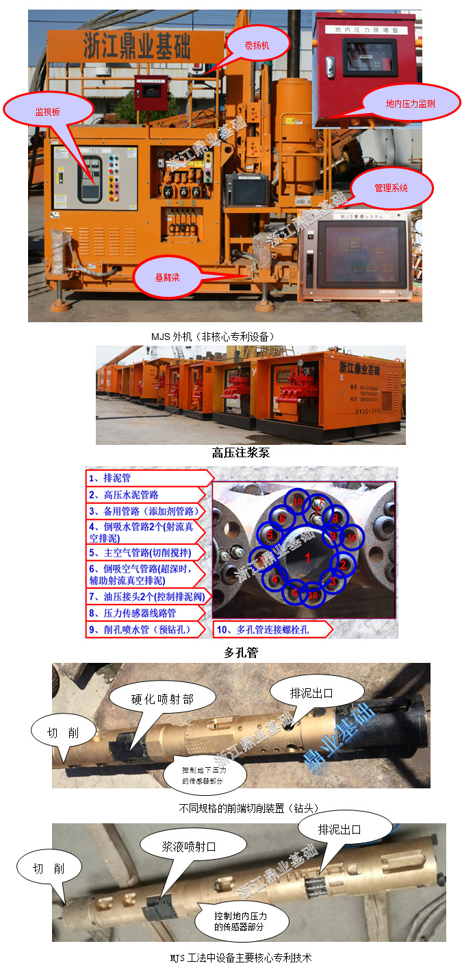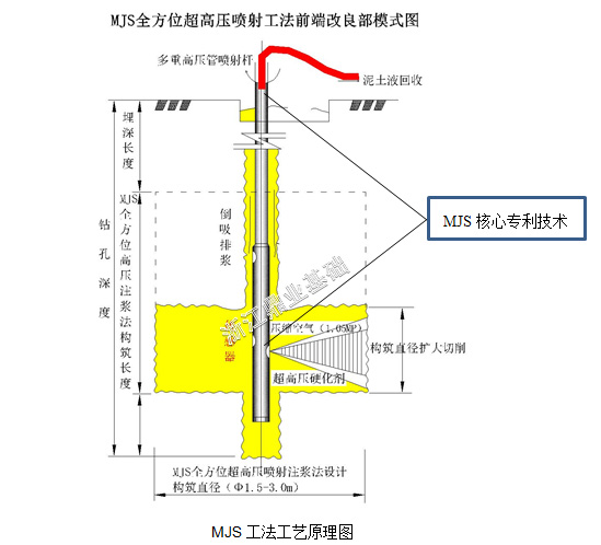 MJS工法是從綜合角度出發(fā),將硬化材料泥漿的配料直至加壓輸送、噴射、地層切削、混合、強制排泥、集中泥漿這一系列工序作為監(jiān)控對象。是一種能進行水平地基加固和垂直360°全方位地基加固的施工工法,對于周邊環(huán)境及地基擾動影響微小。MJS工法在傳統(tǒng)高壓噴射注漿工藝的基礎(chǔ)上,采用獨特的多孔管和前端造成裝置,配有一套控制地內(nèi)壓力的控制系統(tǒng)對漿、氣及地下壓力進行監(jiān)控,實現(xiàn)了孔內(nèi)強制排漿和地下壓力監(jiān)測,并通過調(diào)整強制排漿量來控制地內(nèi)壓力,對周邊的擾動小,大幅度減少對環(huán)境的影響。